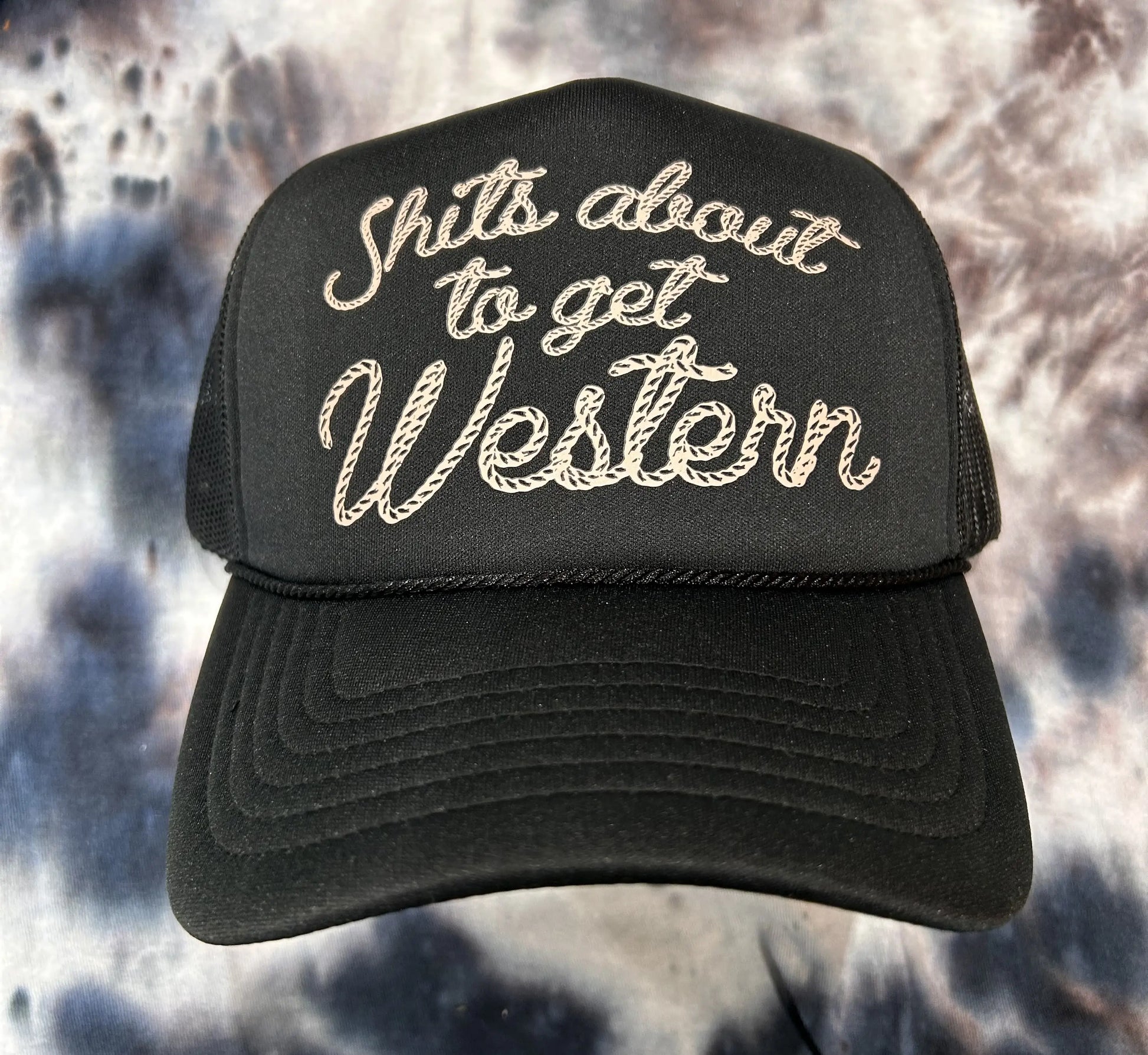 Shits About to Get Western design printed onto your favorite foam trucker hat. Foam truckers have a foam front, mesh back, and adjustable snapback enclosure. Don't forget to pair with one of our trucker hat chains for the perfect western trucker.